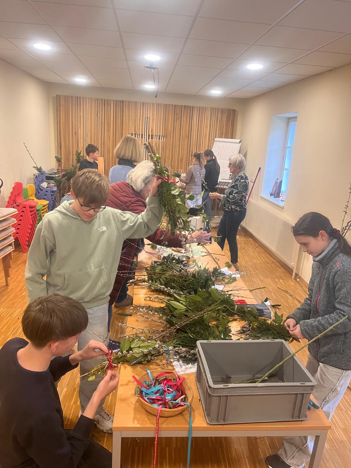 GERERSDORF - Die Ministrantinnen und Ministranten der Pfarre haben gemeinsam mit erfahrenen Helferinnen und Helfern traditionelle Palmbuschen für den Palmsonntag vorbereitet.