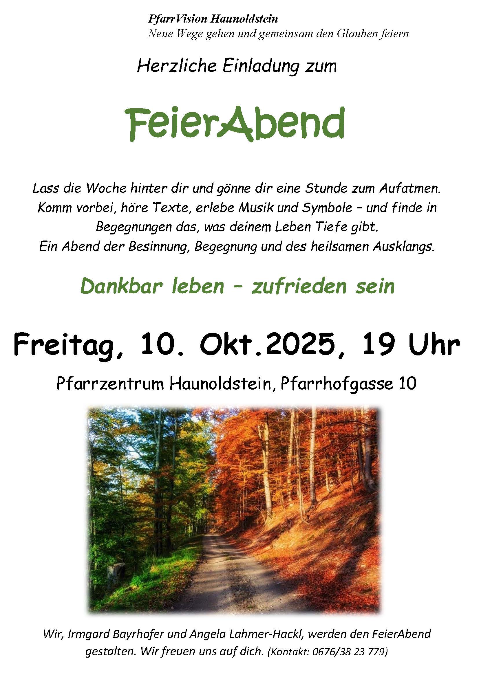 Der nächste FeierAbend ist am Freitag, 28. Nov., um 19:00 Uhr im Pfarrzentrum Haunoldstein.