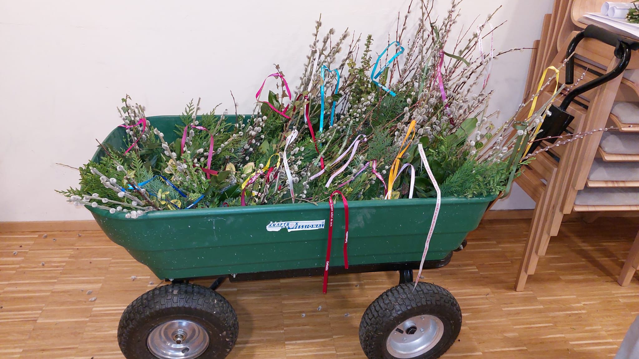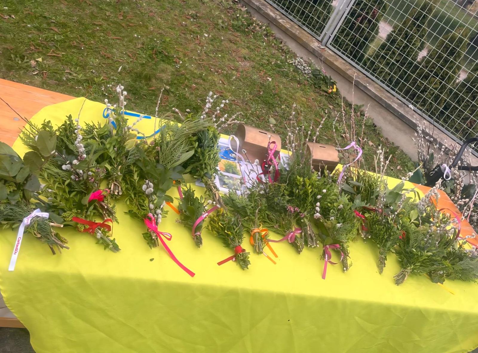 Am Palmsonntag standen die fertigen Palmbuschen schließlich vor der Heiligen Messe bereit. Viele Kirchenbesucher nutzten das Angebot und nahmen einen der gebundenen Zweige mit in die Feier.